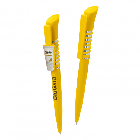 • Retractable ballpoint pen with a spring-loaded upper barrel